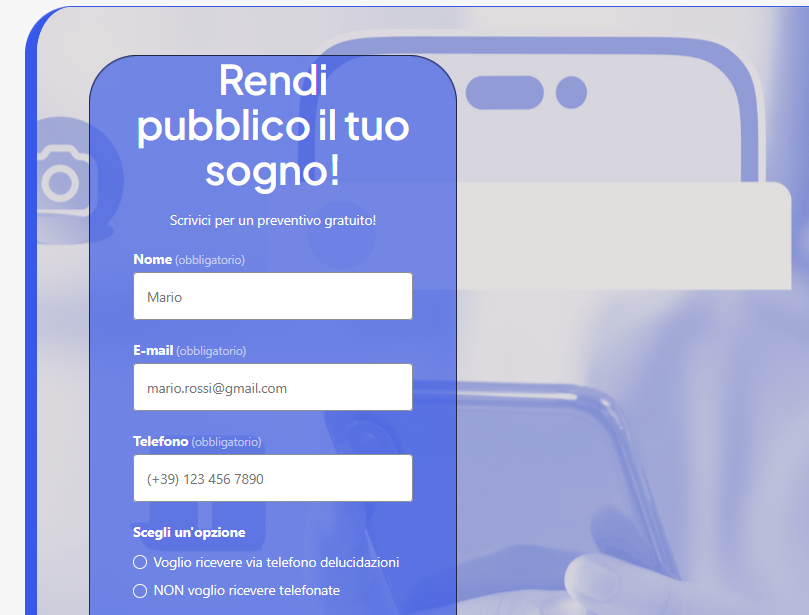 Vai nella sezione contatti, inviaci una E-mail o riempi il form, spunta la casella se vorrai ricevere una telefonata o non farlo e verrai contattato via mail
